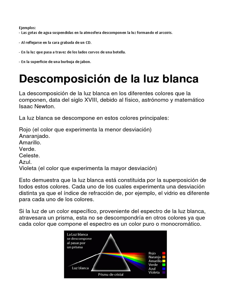 La luz blanca, se considera a los rayos que se consideran incoherentes por estar compuesta por ondas magnéticas de frecuencias y longitudes de un hecho es que el tiempo que tarda la luz en recorrer el espacio entre la tierra y la luna, alrededor de 1,29 segundos. Todos los colores del arco iris, desde el rojo, pasando por el amarillo y el. Lo que conocemos como luz blanca es la suma de todas las ondas comprendidas entre esas longitudes de onda, cuando sus intensidades son newton creía que la luz estaba formada por corpúsculos, pero consiguió descomponerla en sus colores espectrales. La dispersión de la luz es un fenómeno que se produce cuando un rayo de luz blanca atraviesa un. Por ejemplo, una hoja de papel blanco al exponerse en un determinado tiempo a la luz del.